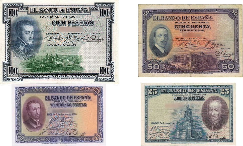 En cuanto a los billetes emitidos durante el reinado de Alfonso XIII que circularon durante la II República hubo cuatro emisiones: en 1925, 1926, 1927 y 1928.