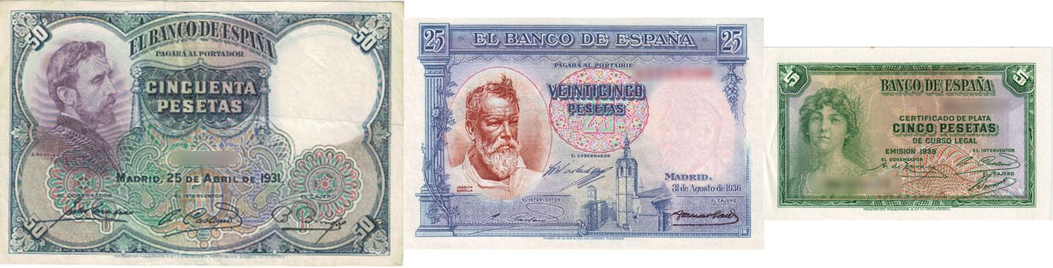 Durante este periodo también circularon billetes emitidos con anterioridad a 1931, los de los últimos años del reinado de Alfonso XIII (1925 a 1928) por lo que podemos considerarlos también como republicanos.