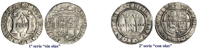 En cuanto a las acuñaciones en plata, las primeras fueron a nombre de Carlos y Juana y se acuñaron a martillo piezas de 8 reales y de sus divisores. Hubo dos estilos diferentes, los denominados “sin olas” de la 1ª serie (1536-1542) y los “con olas”, de la 2ª serie (1542 a 1572).
