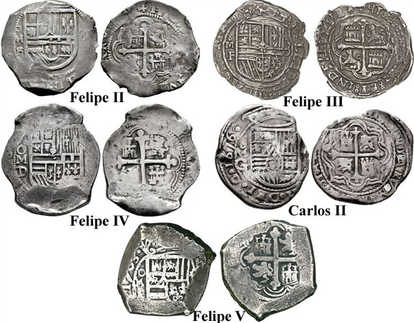 A estas les siguieron las piezas con el escudo de armas en anverso y cruz en reverso y que comenzaron con Felipe II (1572) y terminaron con Felipe V (1732). Todas estas también se acuñaron a martillo. La cruz en los reversos de las monedas de plata de México es inconfundible ya que terminan en extremos lobulados característicos de esta ceca.