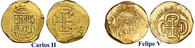 Las acuñaciones en oro dan comienzo en 1679 (Carlos II). Serán a martillo hasta 1732 y siguen la tónica de las de plata aunque el tipo de cruz es diferente, de Jerusalén, y siempre dentro de un tetróbolo y ambos variarán algo la forma según los años y reinados.