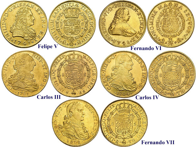 Las acuñacionesde oro mecanizadas, ya con retrato en el anverso, comenzaran en 1732, con el escudo de armas coronado en el reverso y finalizarán en 1821. Se acuñaron monedas de 8 escudos y sus correspondientes divisores de 1, 2 y 4 escudos.